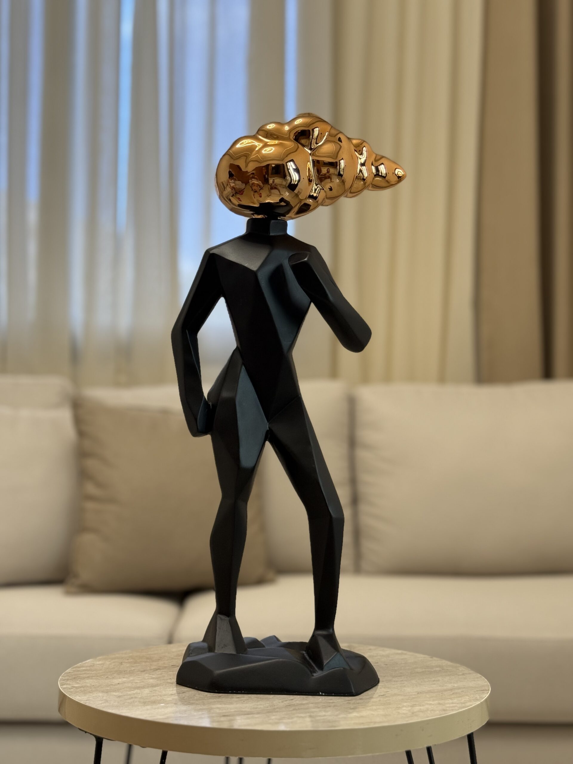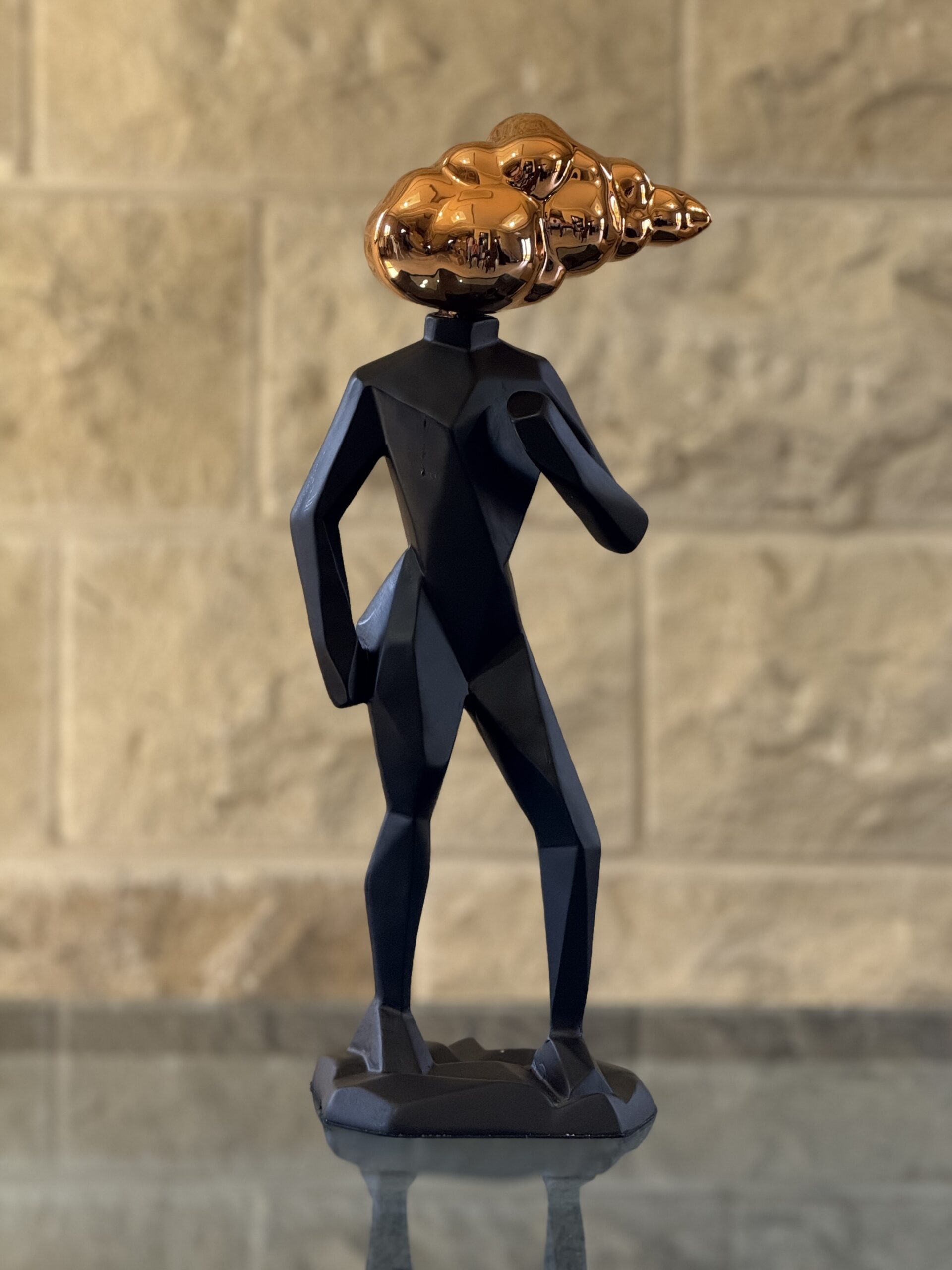 A bold sculpture featuring a faceted black body crowned with a striking bronze abstract head. The piece symbolizes imagination and vision.