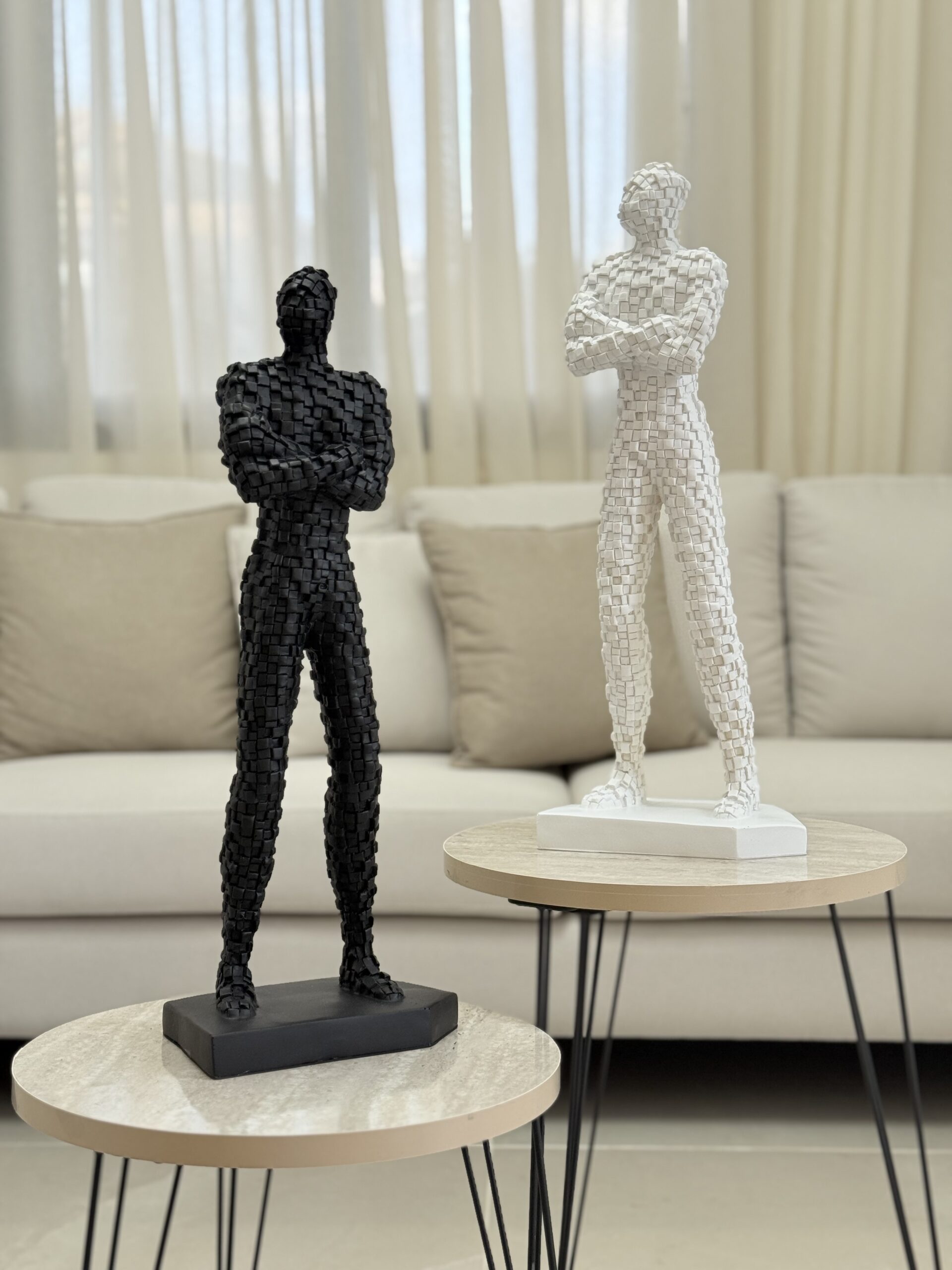 A striking large resin sculpture designed with a unique pixel-like texture, available in bold black and white. This modern art piece embodies strength and elegance, making it a standout addition to contemporary home decor.