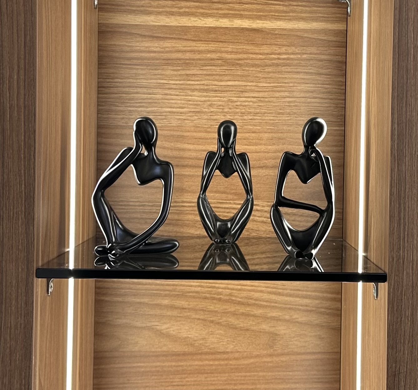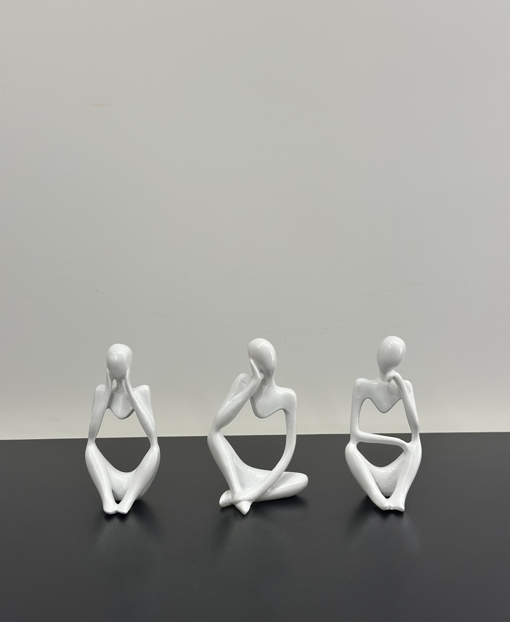 A modern set of three abstract resin sculptures, each depicting a faceless figure in a thoughtful pose. With smooth white finishes and minimalist design, this trio brings elegance and a sense of calm reflection to any home or office decor.