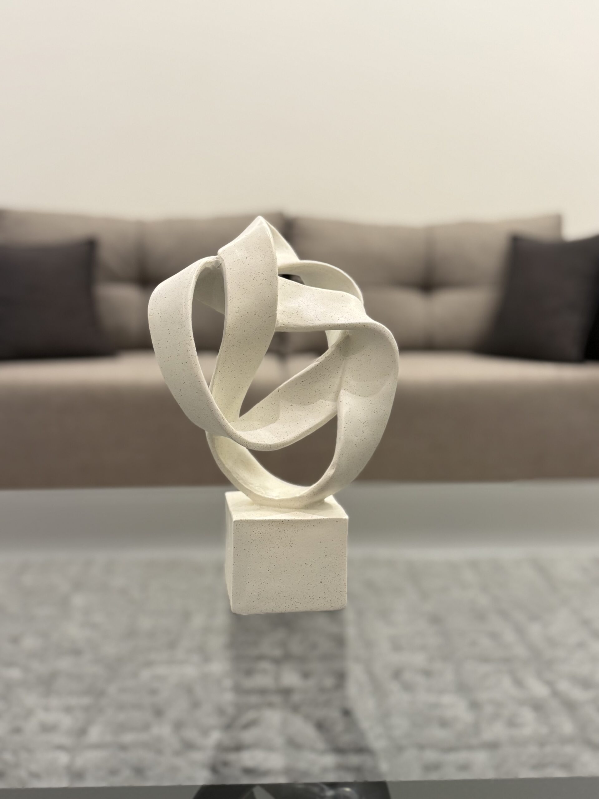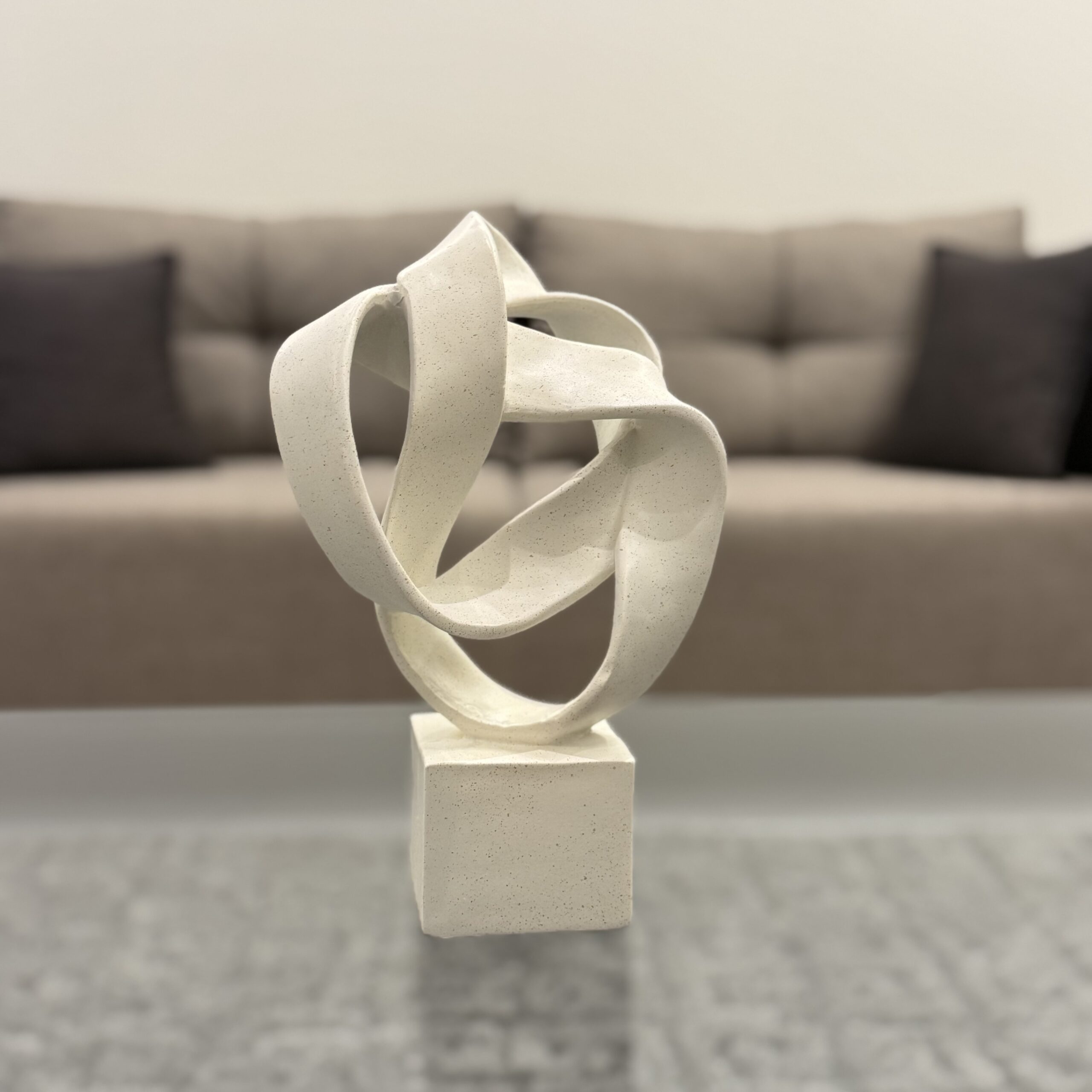 A modern abstract resin sculpture featuring interwoven flowing loops on a square base. Its smooth matte finish and minimalist design make it an elegant decorative accent for contemporary living spaces, offices, or shelves.