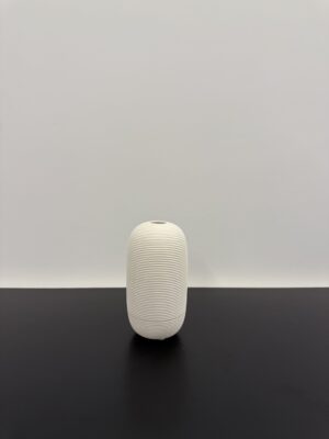 A unique, softly flattened glass vase with a modern silhouette. Its elegant shape makes it perfect for displaying delicate blooms or standing alone as a stylish décor accent.