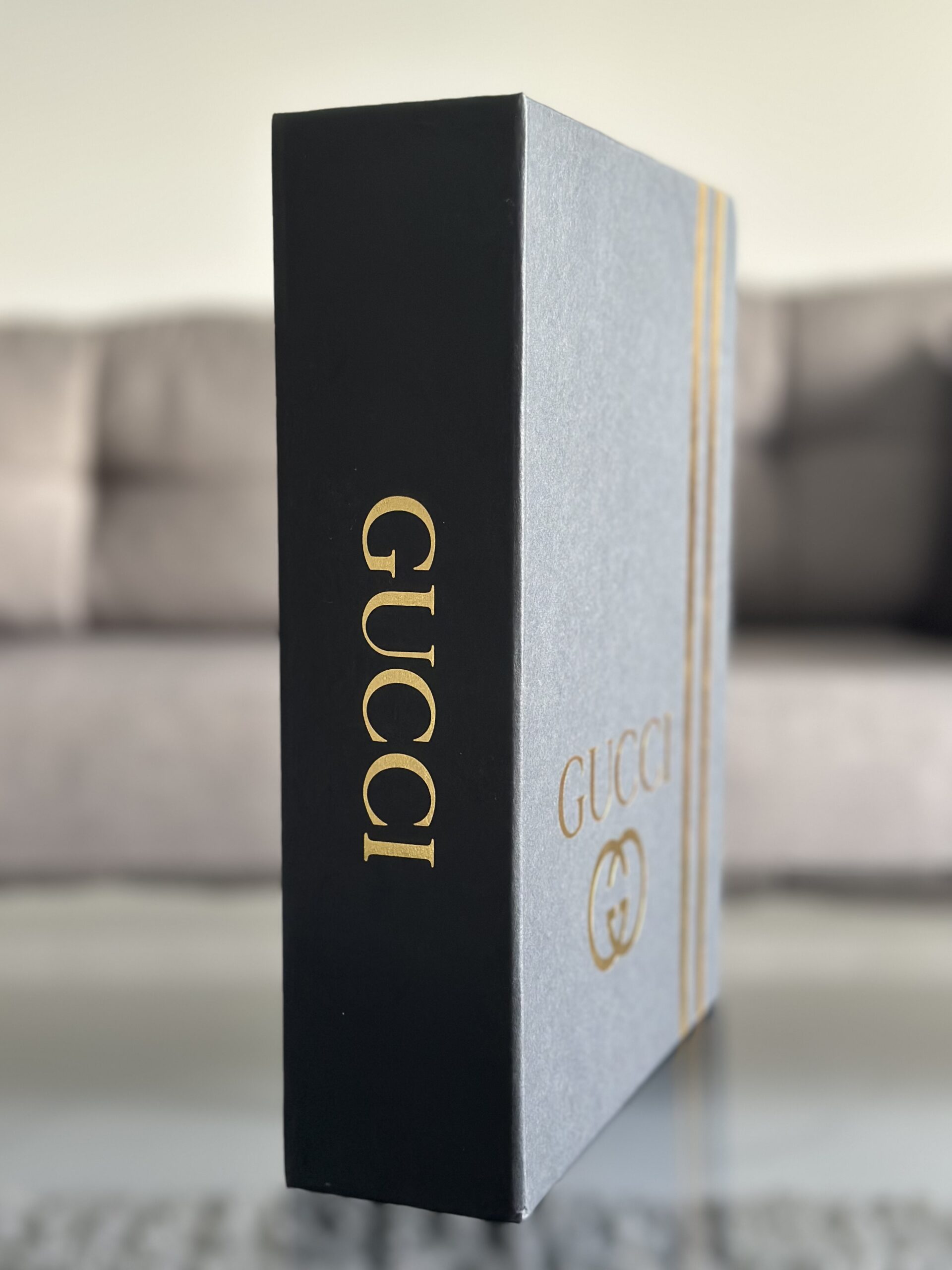 This large Gucci-inspired decorative book features a sleek black cover with elegant gold foil branding and signature stripe detailing. A perfect luxury accent for coffee tables, shelves, or modern interiors, it adds a bold and sophisticated touch of designer style to any space.