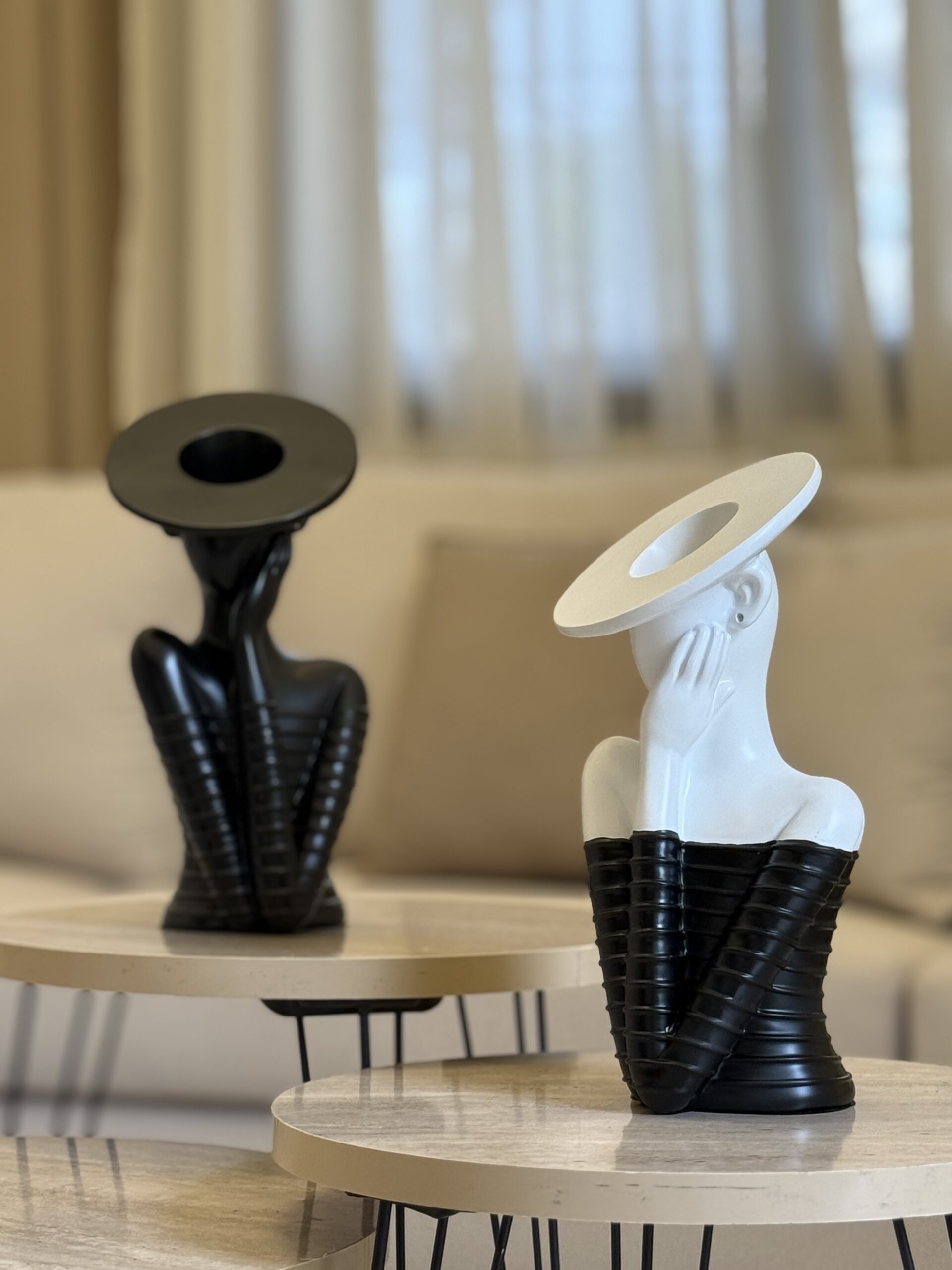 The Halo Elegance Sculpture is a striking modern art piece available in black and white. Crafted from high-quality resin, it features a graceful female figure with a bold circular halo design, symbolizing beauty and sophistication. Perfect for adding a touch of contemporary art and refined style to your living room, office, or gallery space.