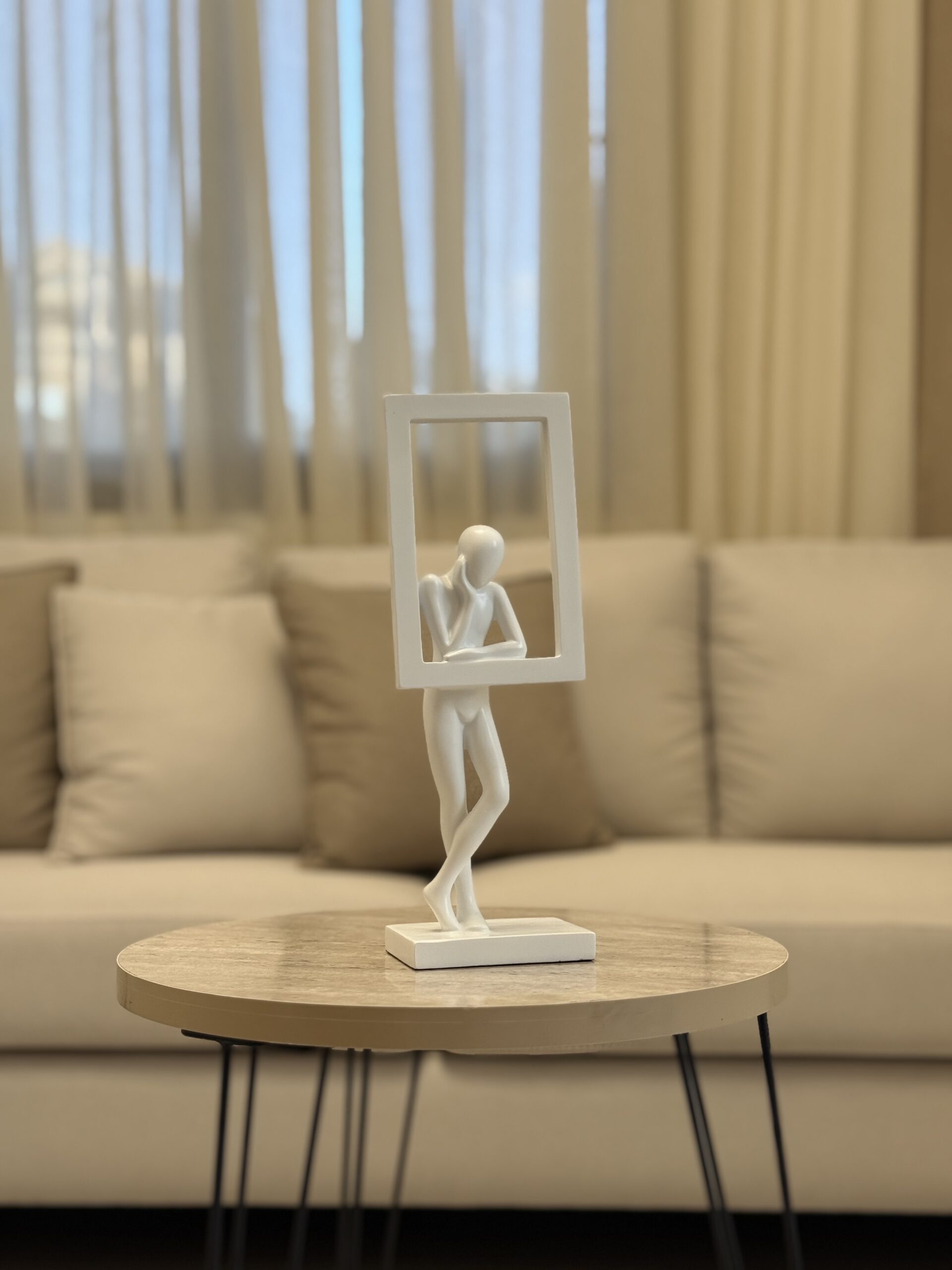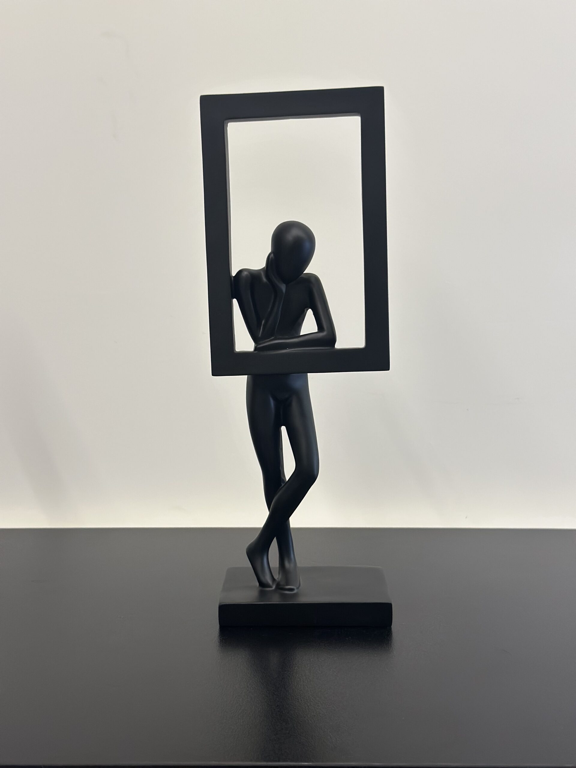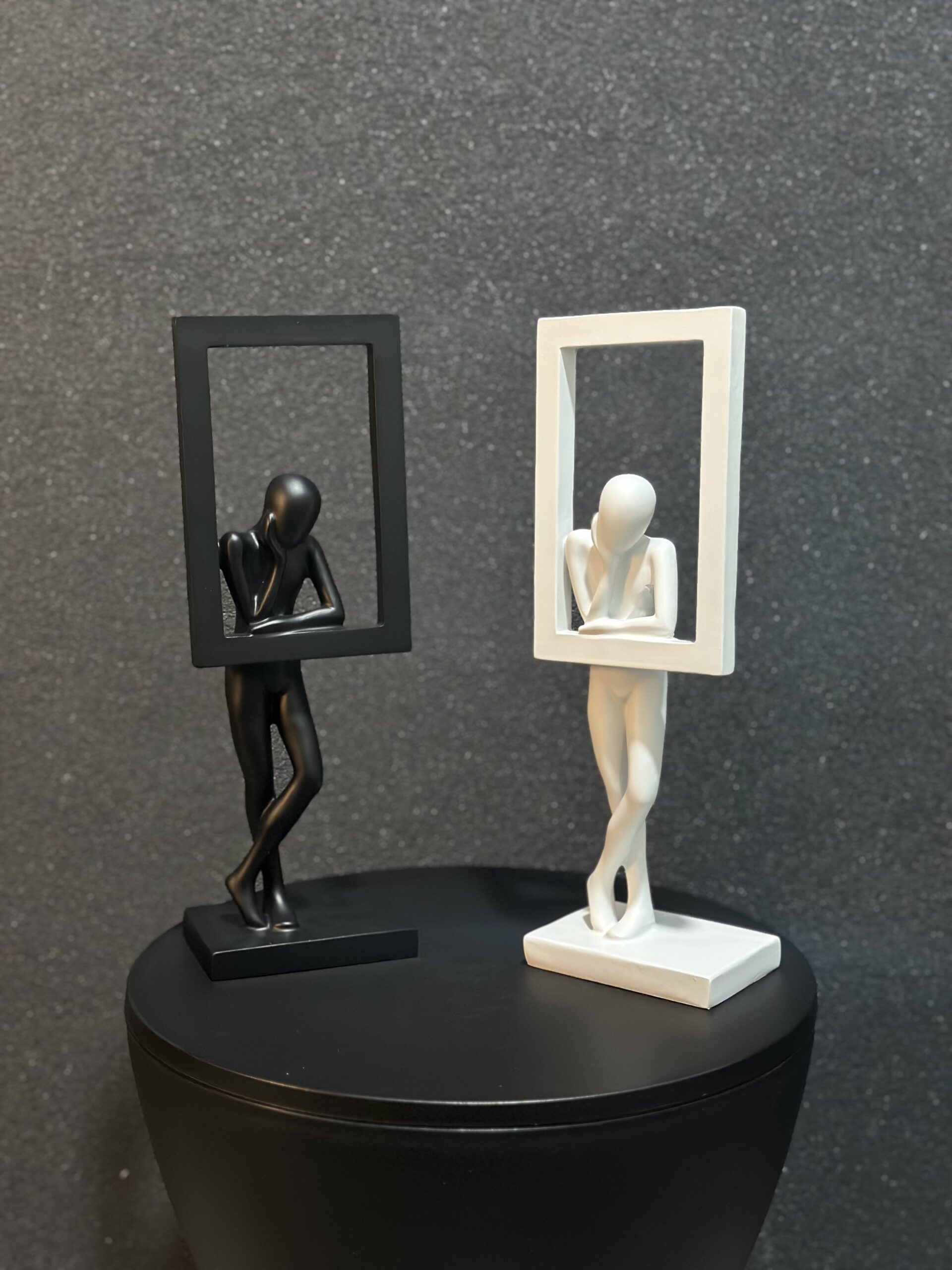 A modern resin sculpture of a man gazing from a window, available in sleek black and white. Its minimalist design adds a contemplative and elegant touch to any living space.