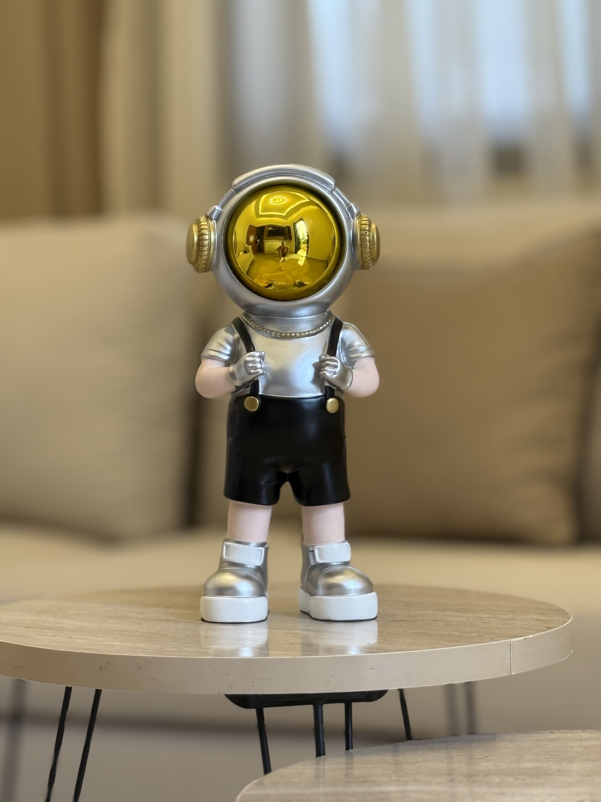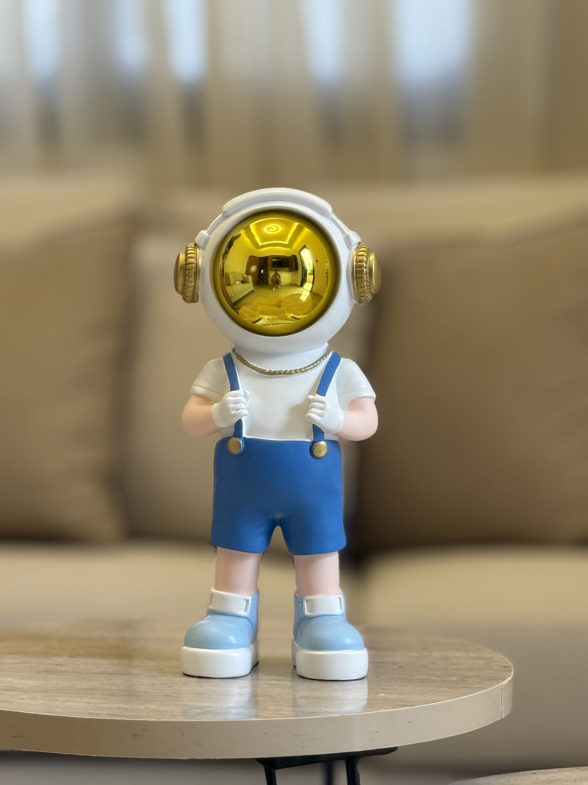 A charming set of resin-made astronaut figures available in two colors — black and blue. Each piece features a glossy gold helmet and fine detailing, symbolizing adventure and imagination. Crafted from high-quality resin, these modern decorative sculptures add a playful futuristic touch to any home or office space.
