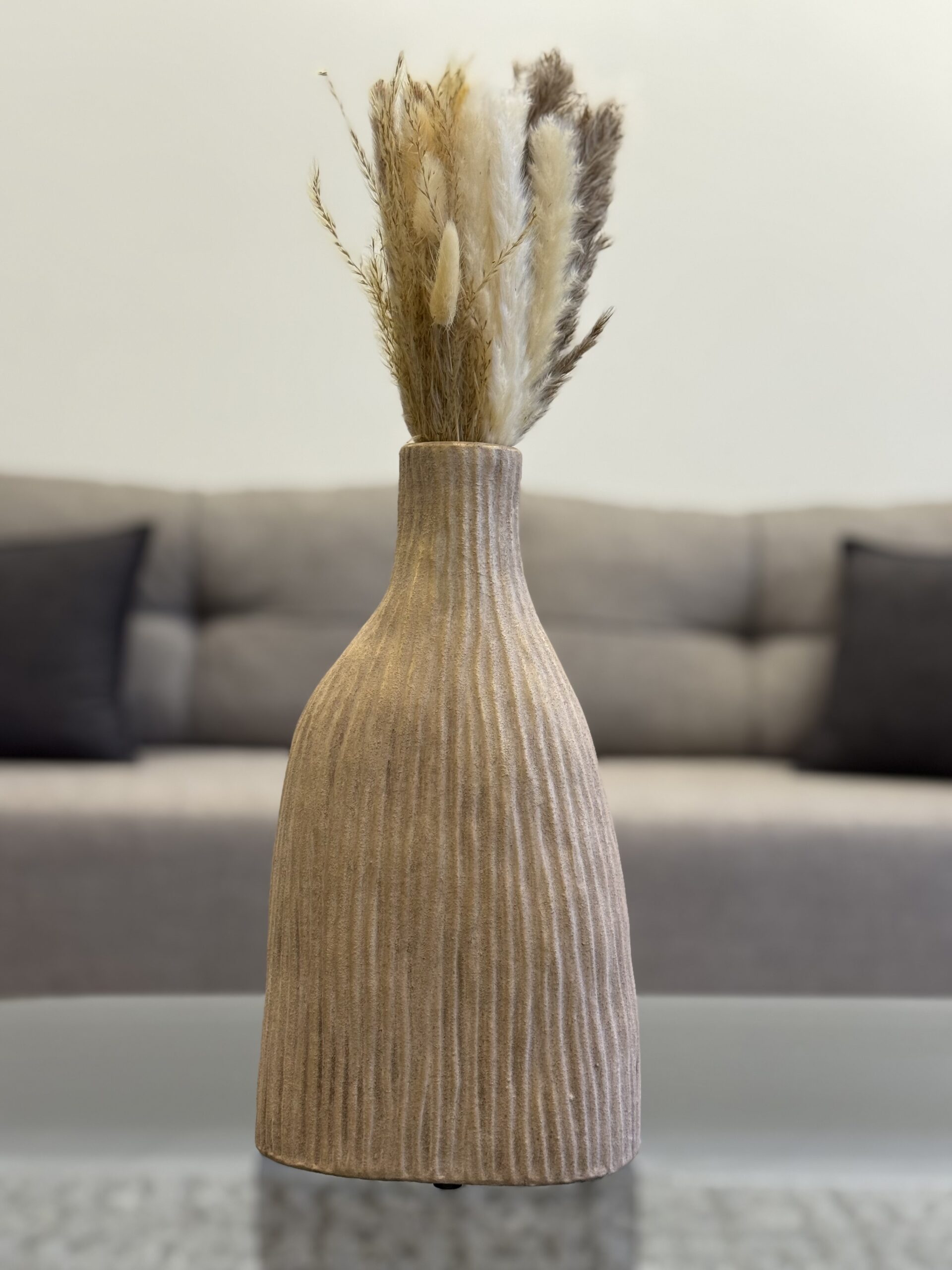 A tall sculptural vase featuring fine vertical ridges and a softly tapered silhouette. Its warm, stone-like finish brings understated texture and modern elegance to any space.