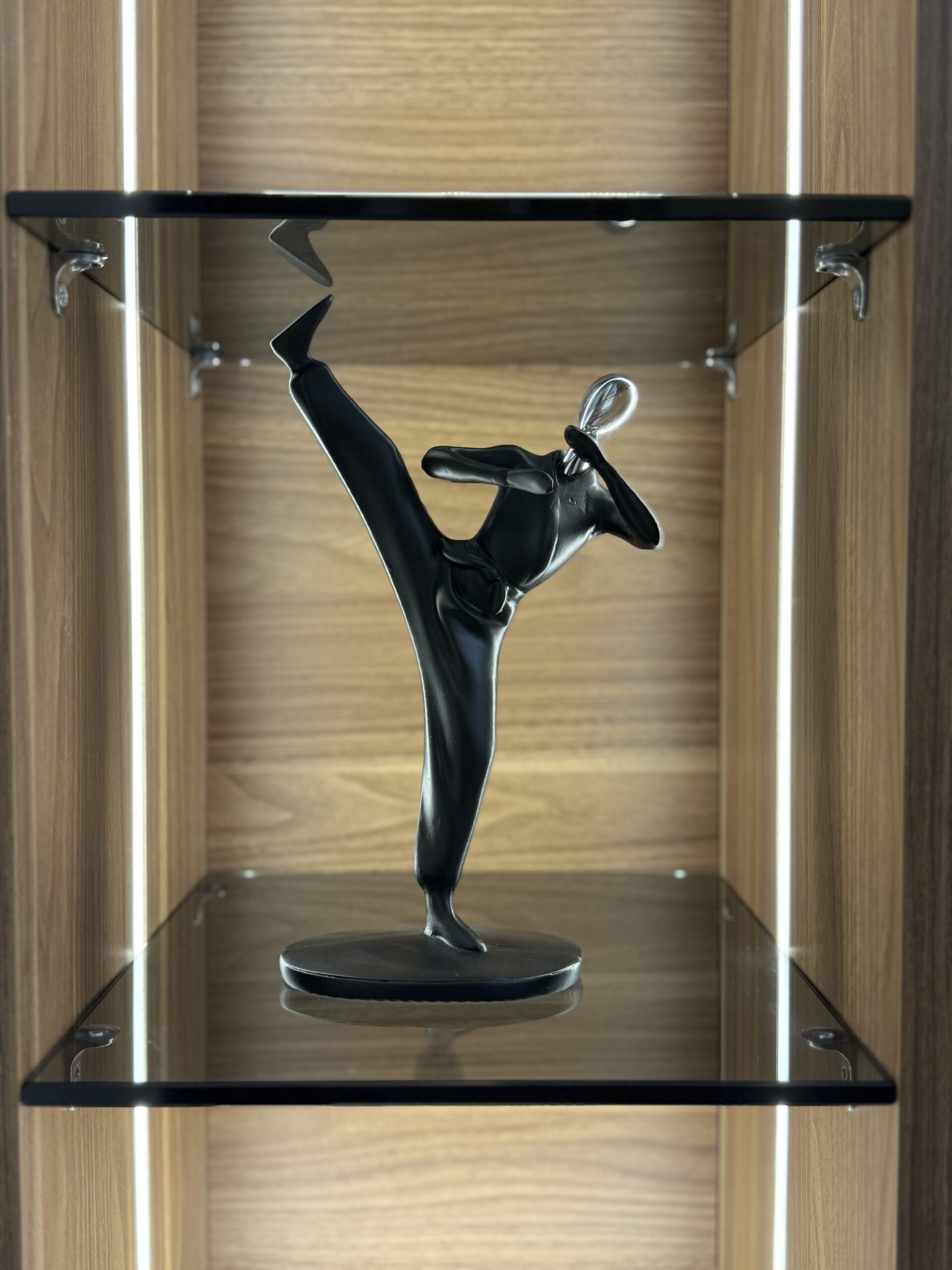 Dynamic resin sculptures capturing the power and grace of a martial artist in motion. Finished in sleek black with gold or silver head options, these high-quality pieces add strength and elegance to any modern space.
