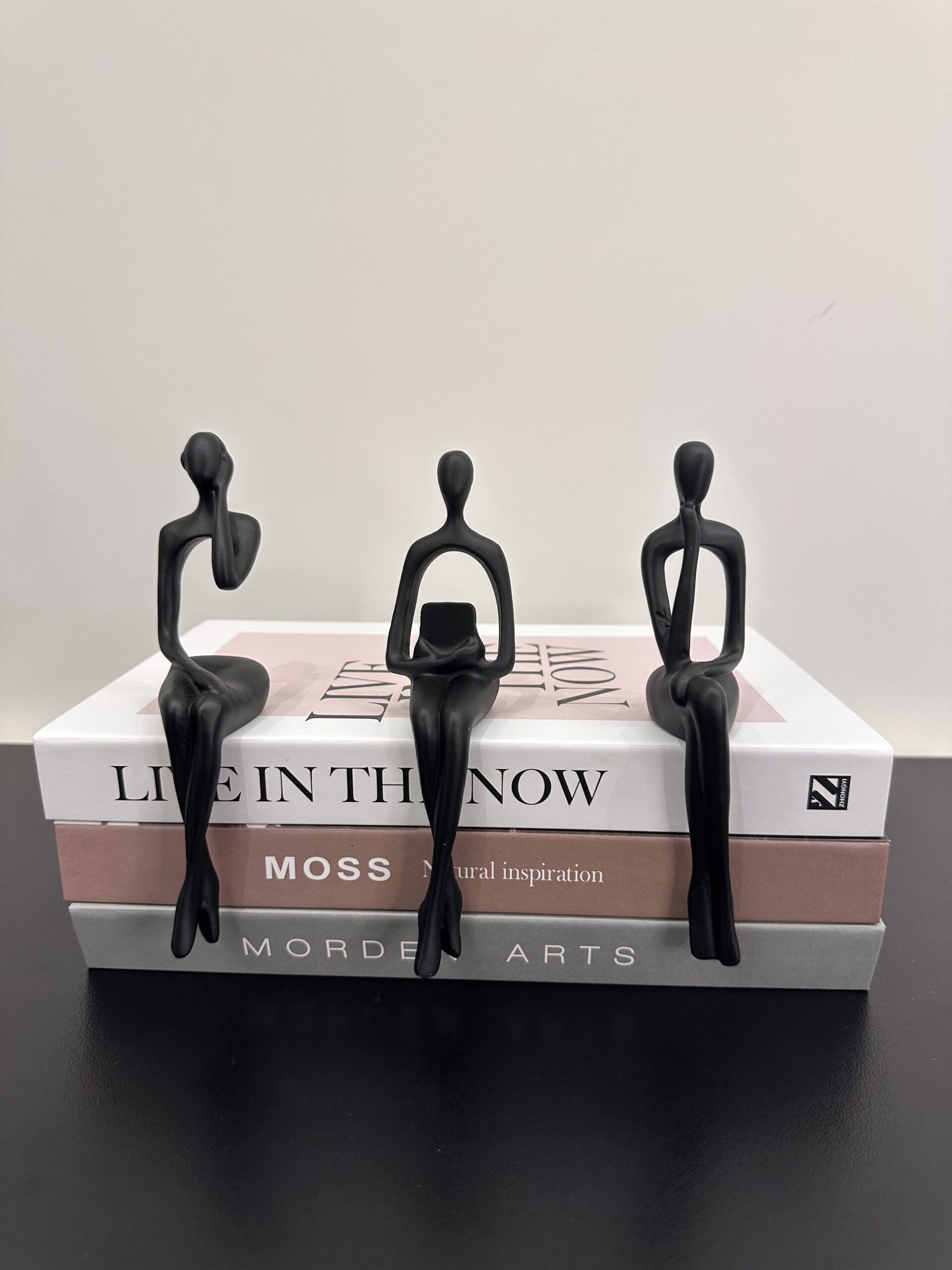 Minimalist seated sculptures with abstract, torso-less forms. Each figure strikes a unique pose—reading, resting, and thinking—perfect for modern interiors.