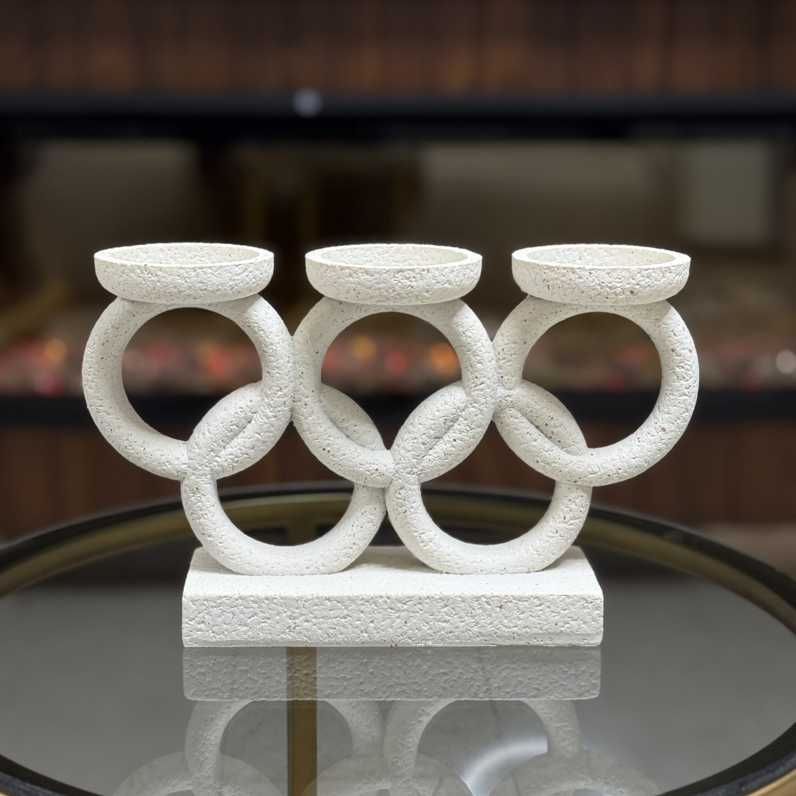 A sculptural candle holder featuring three interlinked loops on a solid base. Designed to create balance and visual interest, it adds a modern, minimalist touch to coffee tables, consoles, or dining settings.