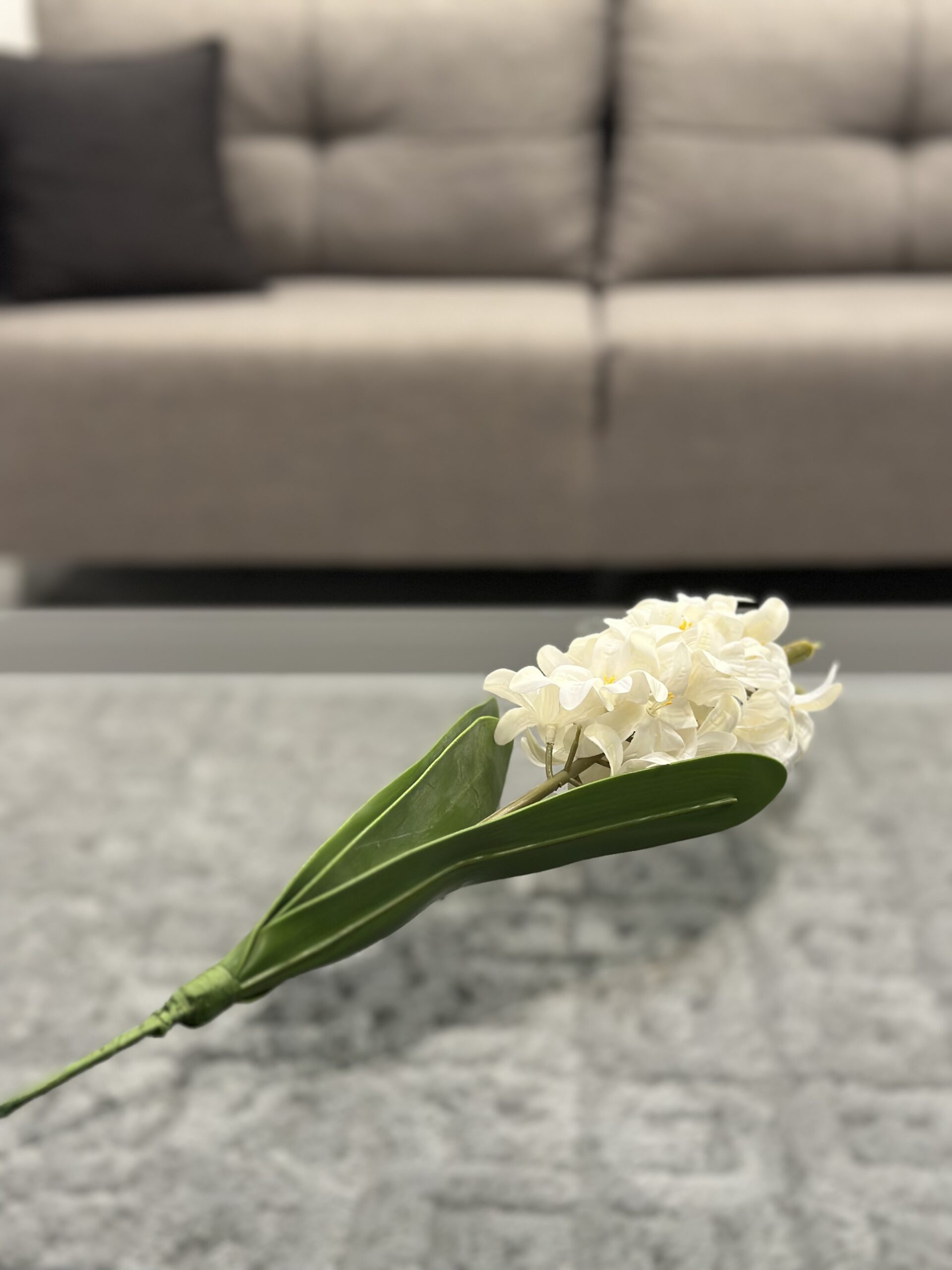 A delicate stem of white hyacinth flowers, featuring soft clustered blooms with a fresh, clean look. Symbolizing purity and peace, this elegant spring flower adds a gentle, timeless charm to any arrangement.
